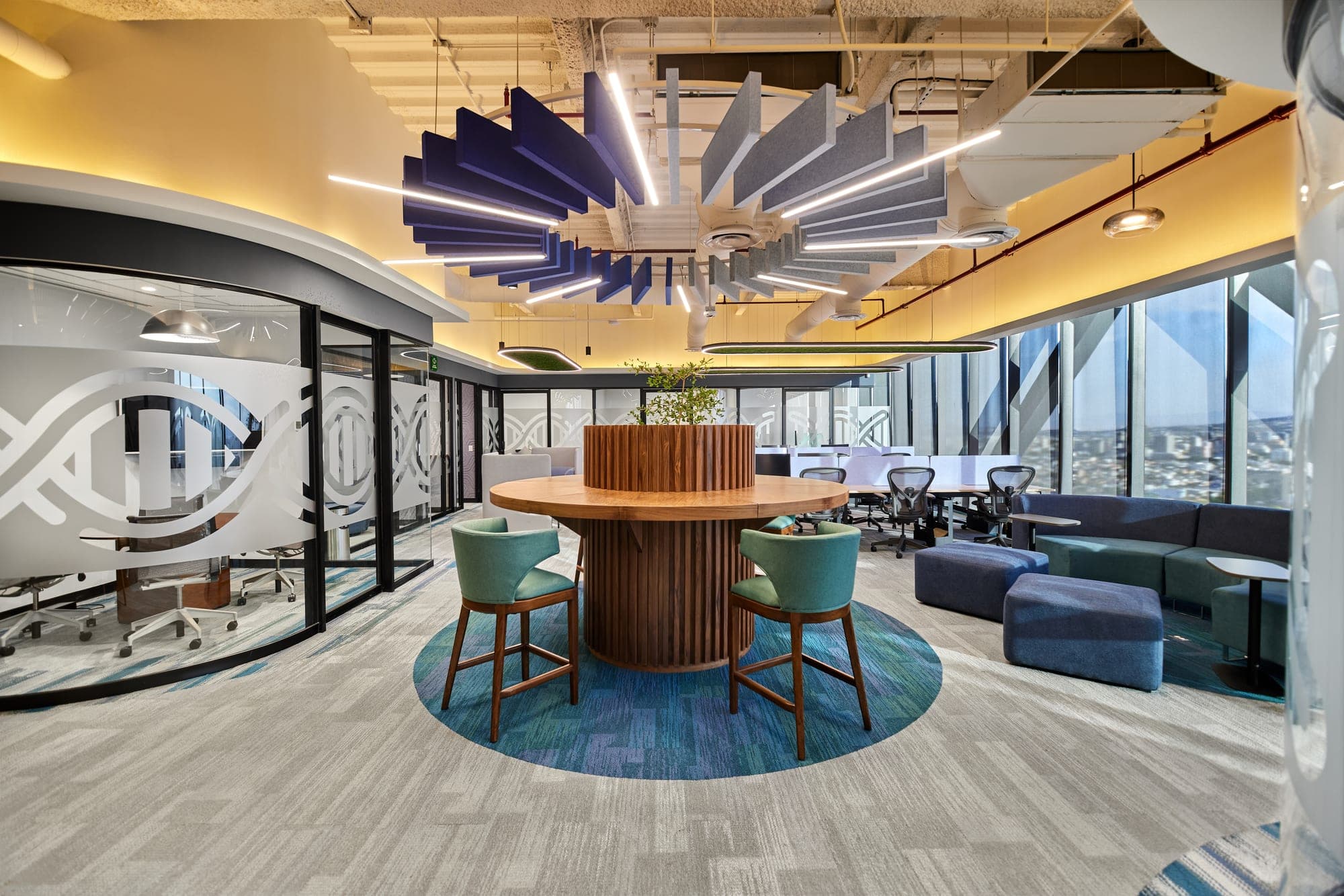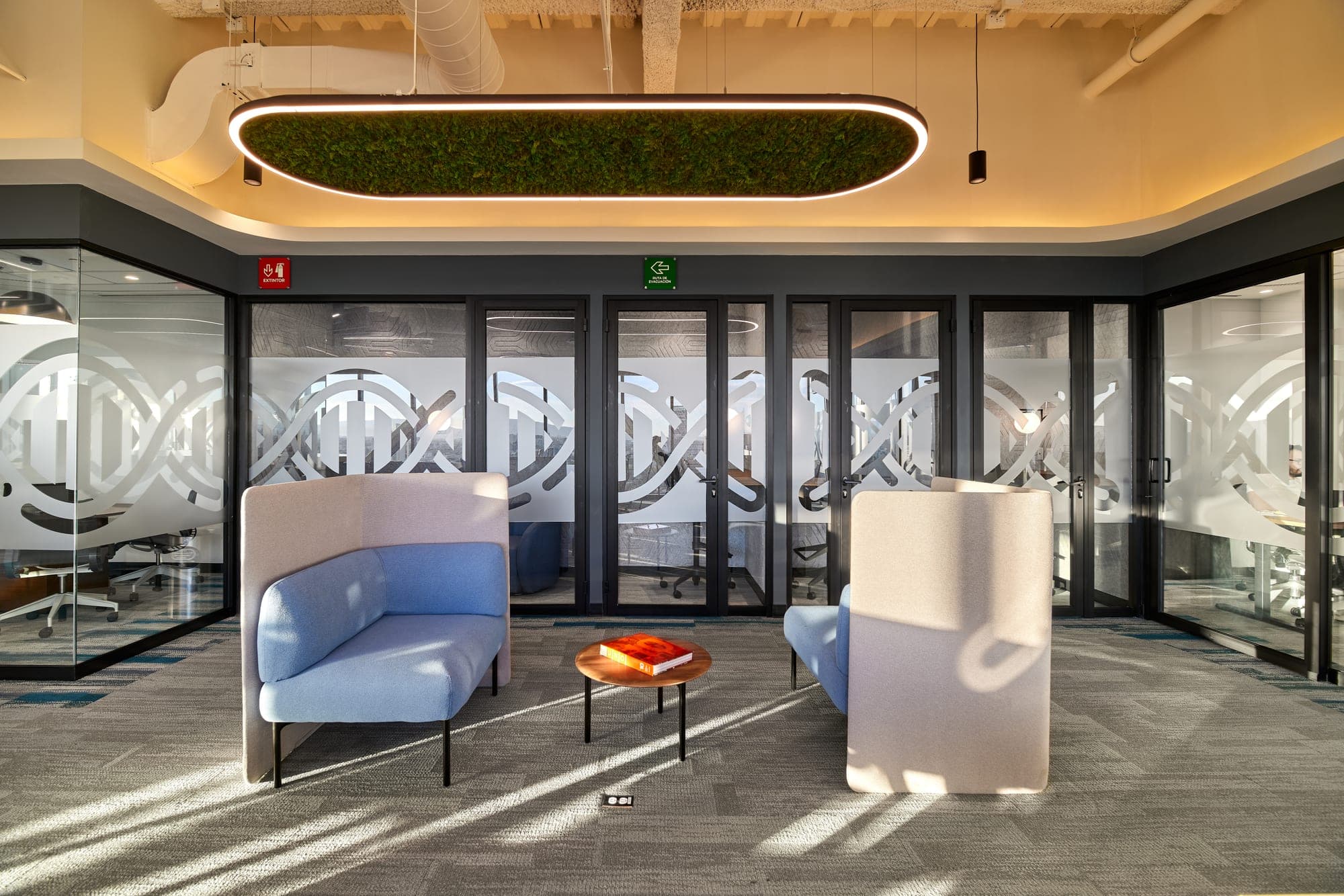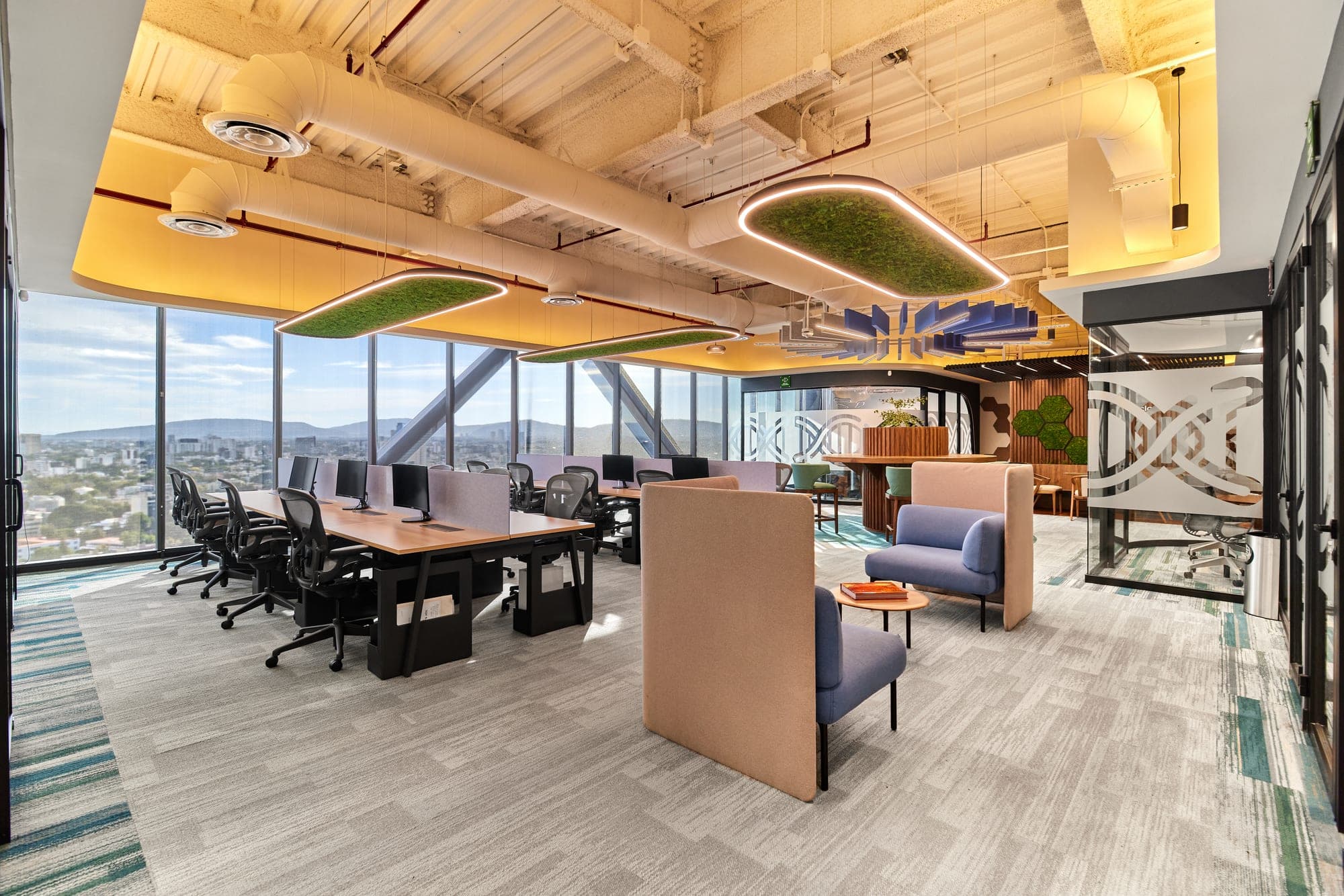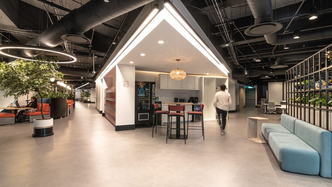 Oficinas de innovación con estrategia lumínica que potencia el bienestar y la identidad de marca. Luz natural complementada con sistemas de control inteligente Lutron.